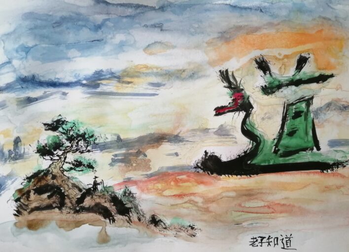 Учитель Лао-цзы хоть и высокую должность на государственной службе занимал, но правителем не был. На рисунке не дракон с востока ползёт, а Дао — … Оно не злое и не доброе, оно равнодушное ко всем…